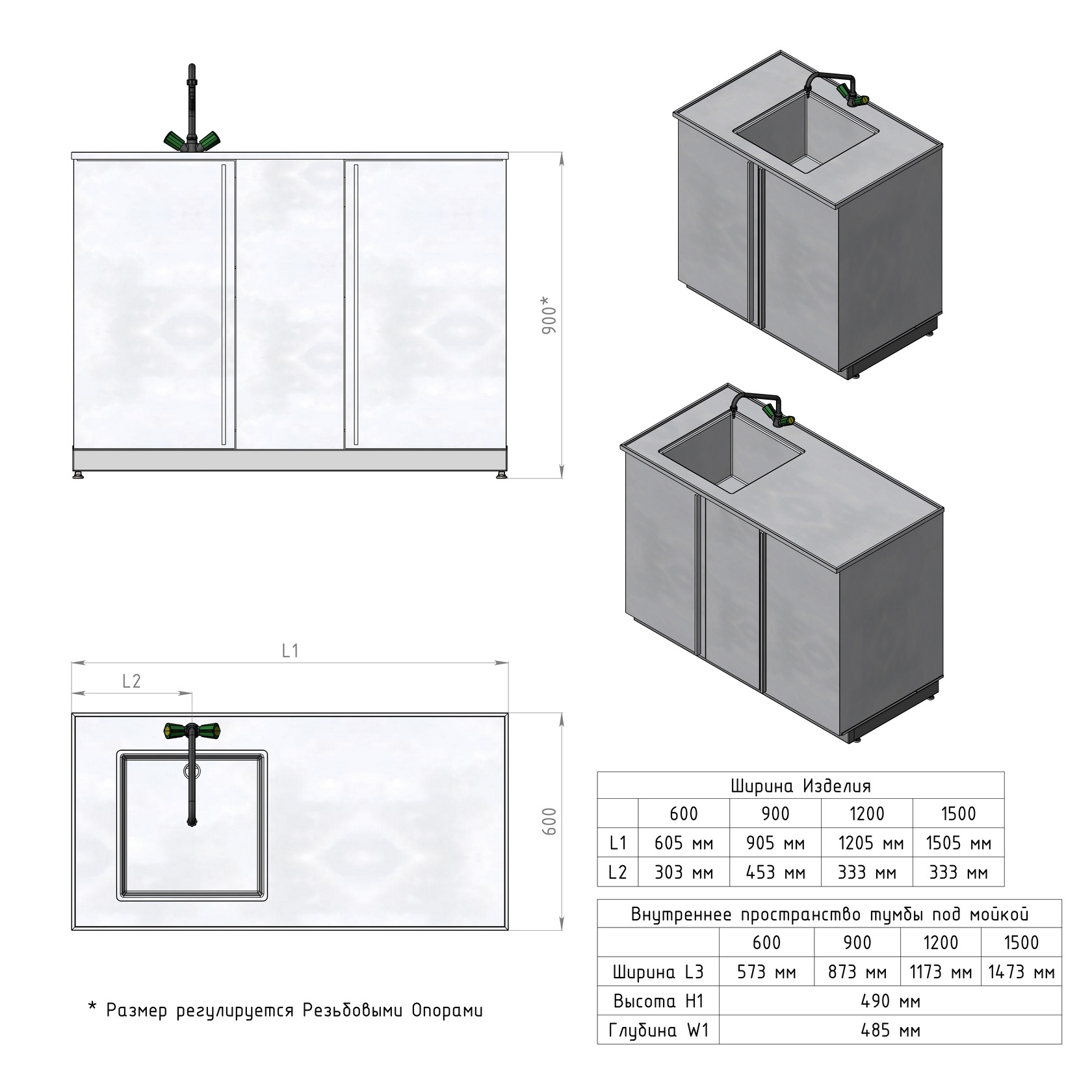 В каркасе предусмотрены регулируемые опоры в диапазоне 0-30 мм для компенсации неровностей пола.