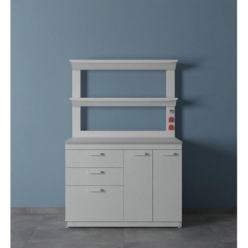 Стол лабораторный с двумя полками ЛК-1200 СП состоит из прочного сборно-разборного металлического каркаса с полимерным покрытием серого цвета, металлической надстройки с двумя полками из стали и столешницы.
