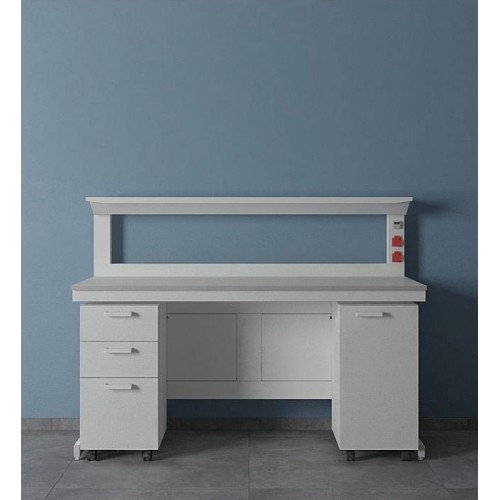Стол лабораторный с полкой ЛК-1800 СМ cостоит из прочного сборно-разборного металлического каркаса с полимерным покрытием серого цвета (RAL 7030), металлической надстройки с полкой из ламинированной ДСП и столешницы. Материал поверхности можно выбрать из нескольких вариантов руководствуясь протоколом испытания материалов столешниц. Правильный выбор материала является залогом долгой службы изделия.